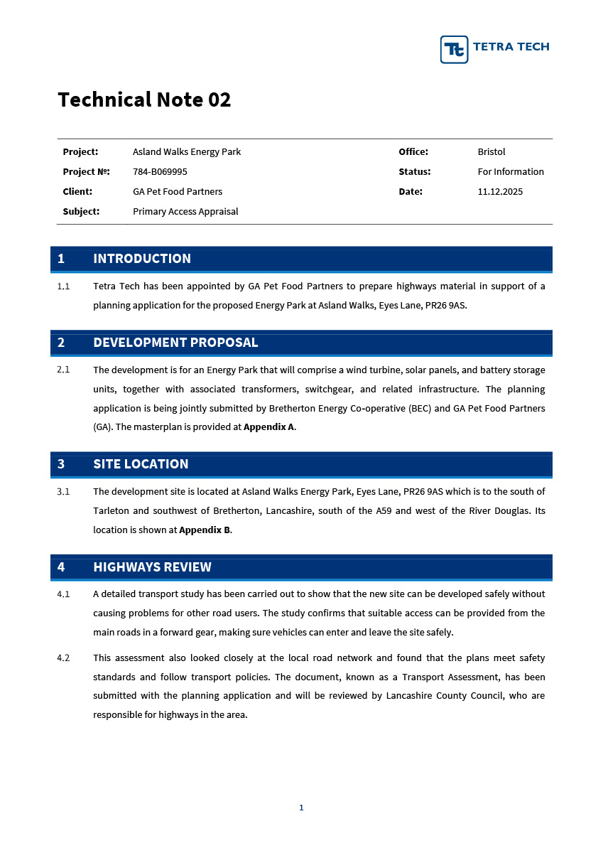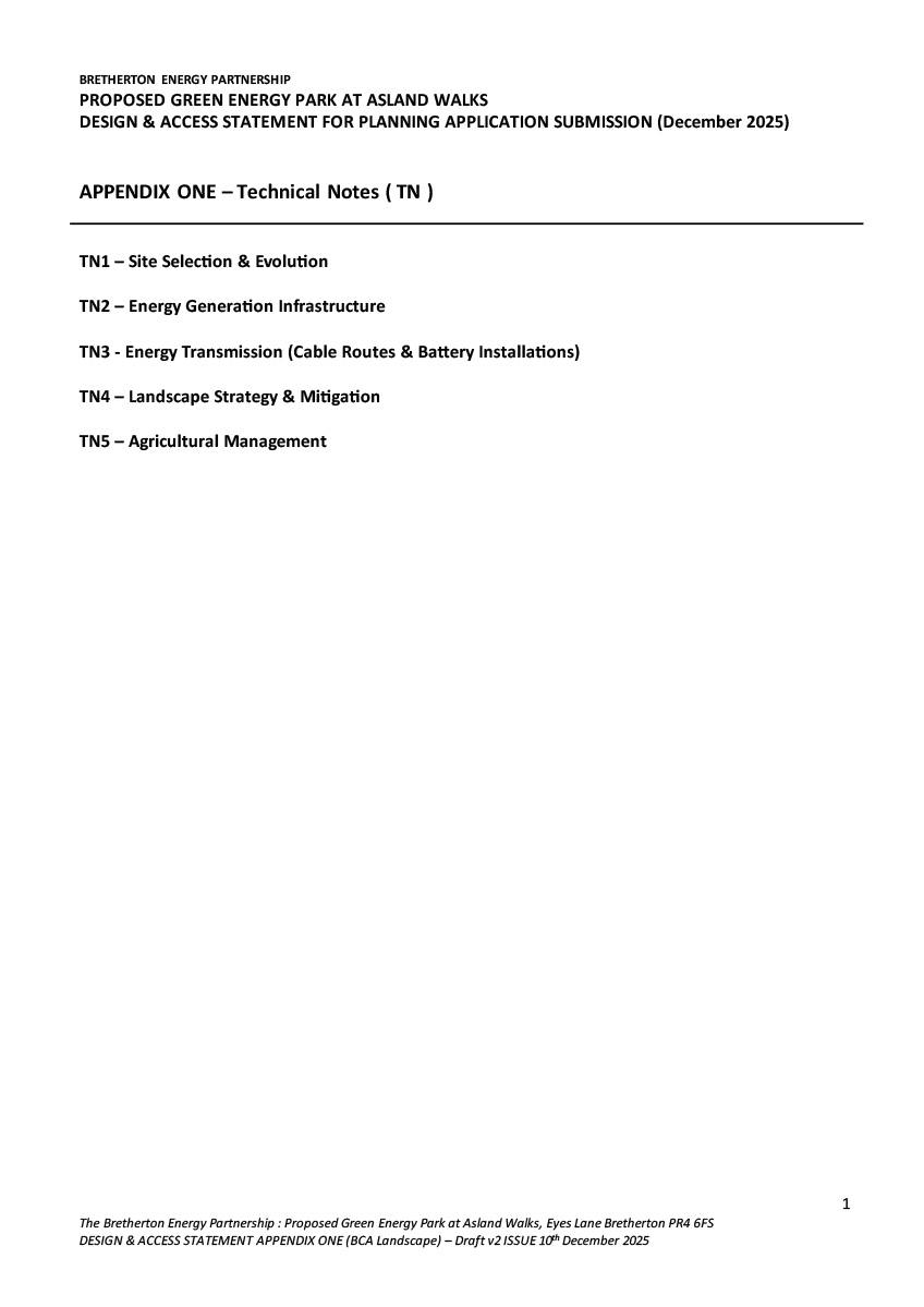 Proposed Green Energy Park at Asland Walks – Design & Access Statement for Planning Application Submission ( December 2025 ) – APPENDIX ONE – Technical Notes ( TN )