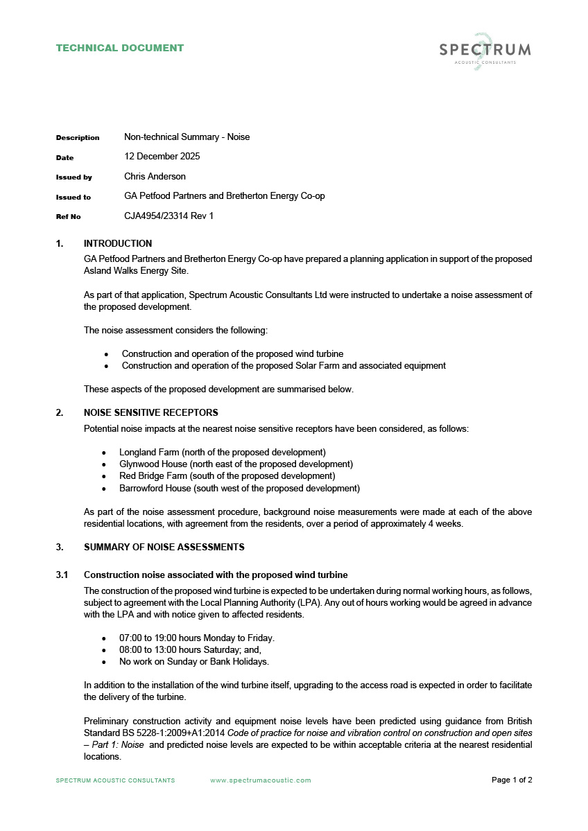 Asland Walks Renewables Project – Noise Assessment based on 1x 111m Hub height Wind Turbine and 1x Solar Farm